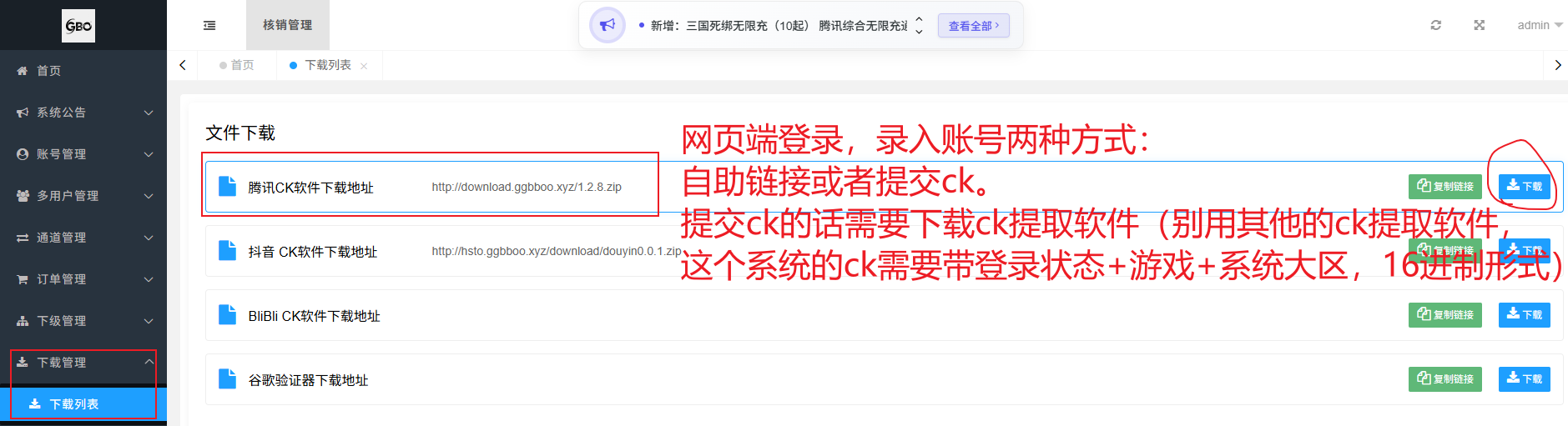 下级账号管理:可以查看和设置下级的充值账户。如果你不是总台的话,也可在该页面给下级进行产码操作